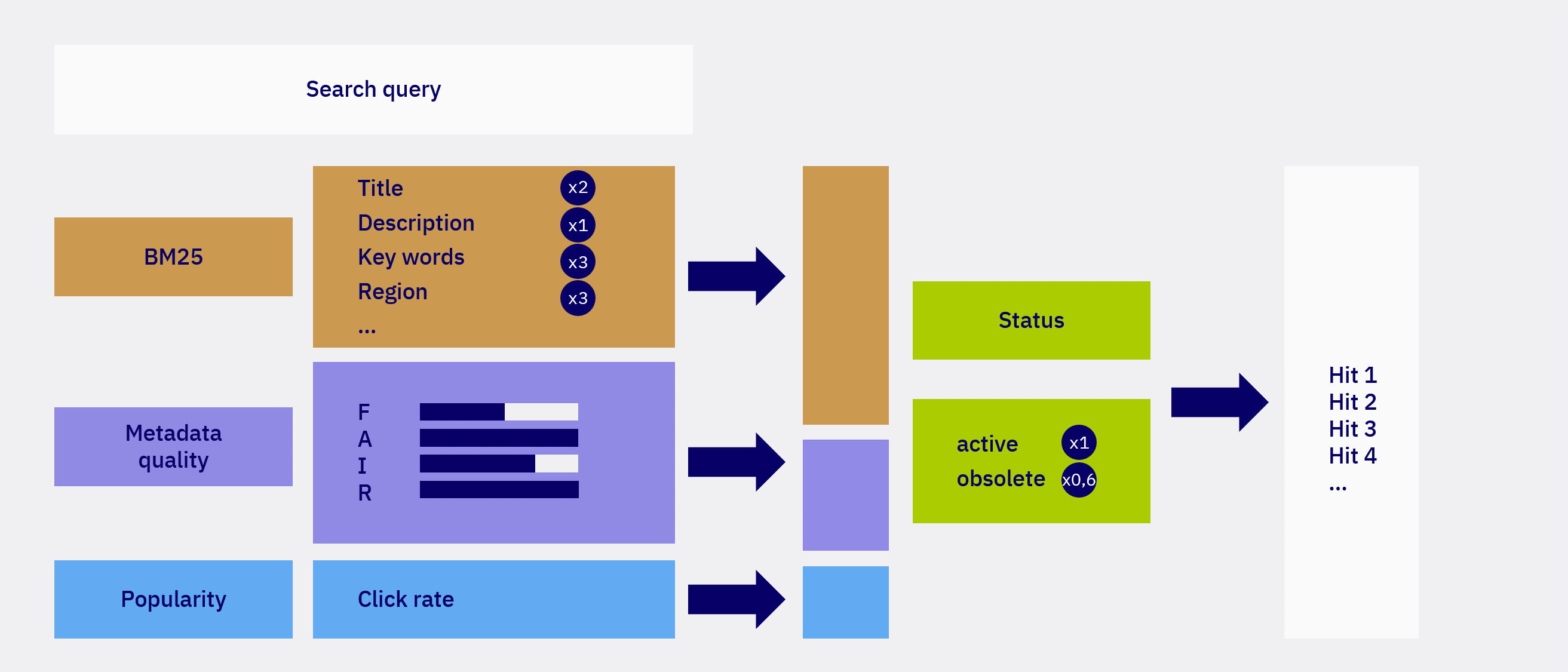 For example, if two entries are close to each other in the BM25 score, a current entry with higher metadata quality and/or popularity would tend to appear higher up. On the other hand, it should be avoided that non-current records with high quality and popularity are prioritised too strongly. This could lead to entries with a relatively low match with the search query still being positioned at the top of the results list.